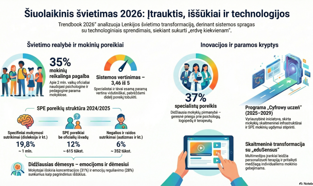 Leidyklos „Nowa Era“ 2026 metų „Trendbook“ pristato šiuolaikines technologijas ir strategijas, skirtas įtraukiojo ugdymo plėtrai. Leidinys parengtas remiantis visos Lenkijos mastu atliktos apklausos rezultatais ir ekspertų įžvalgomis, atskleidžiančiomis pagrindinius iššūkius, su kuriais susiduria mokyklos dirbdamos su įvairių ugdymosi poreikių turinčiais mokiniais. Ypatingas dėmesys skiriamas autizmo spektro sutrikimų turintiems mokiniams, emocinių sunkumų patiriantiems vaikams ir jaunuoliams bei mokymosi individualizavimo svarbai.